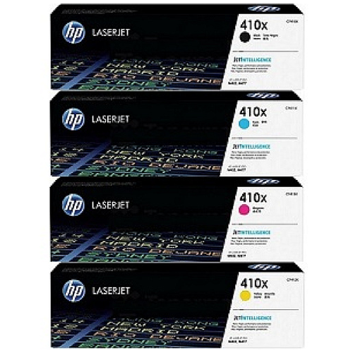 Save time and money with a convenient HP 410X set of four toner cartridges. This set contains one each of Black, Cyan, Magenta, Yellow. The HP 410X set is perfect for high volume color printing environments. Get the same trouble-free, photo-quality business printing at a lower price.